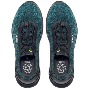 Recycelt bis zum letzten Krümel: Vom Obermaterial bis zur Sohle bietet der neue uvex 1 G2 planet Nachhaltigkeit und Performance in einem. Selbst die angespritzte Polyurethan Zwischensohle enthält bis zu 20% Granulat aus PU Überschuss der eigenen Produktion. Gemäß der Norm DIN EN ISO 14021:2016 besteht er - bezogen auf sein Gewicht - zu 30% aus recycelten Materialien, ohne seine schützenden Eigenschaften und den Komfort gegenüber den bekannten uvex 1 G2 Modellen einzubüßen. Viele Schuhbestandteile, beispielsweise das Obermaterial und die Einlegesohle, wurden zu 100% aus wiederverwendeten Materialien hergestellt.