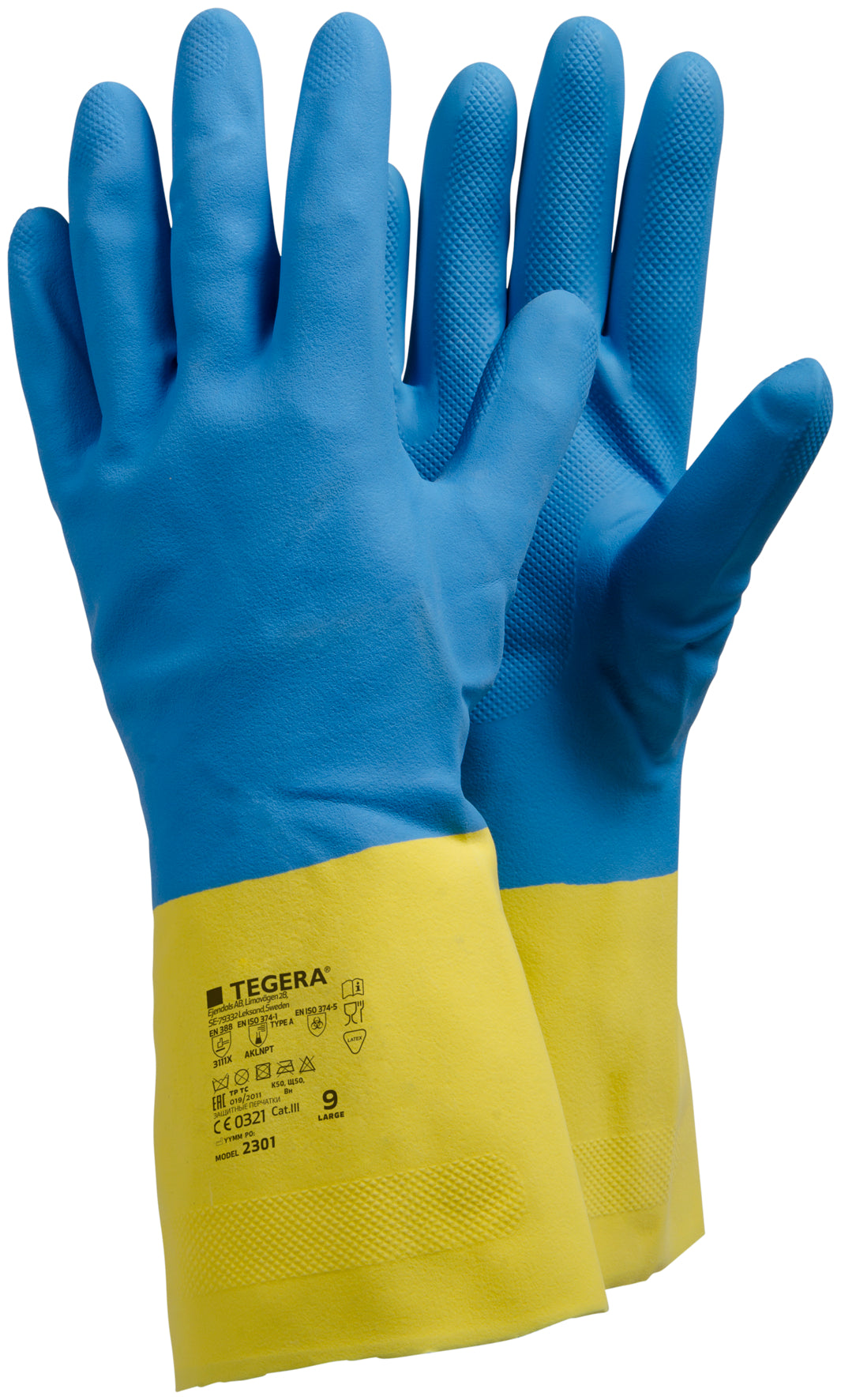 TEGERA 2301, Leicht angerauter, weicher und bequemer Chemikalienschutzhandschuh, zweifarbig und aus zwei Materialien – Naturkautschuk und Neopren. Dicke der Chemikalien-Schutzschicht: 0,7 mm/27, 5 mil.