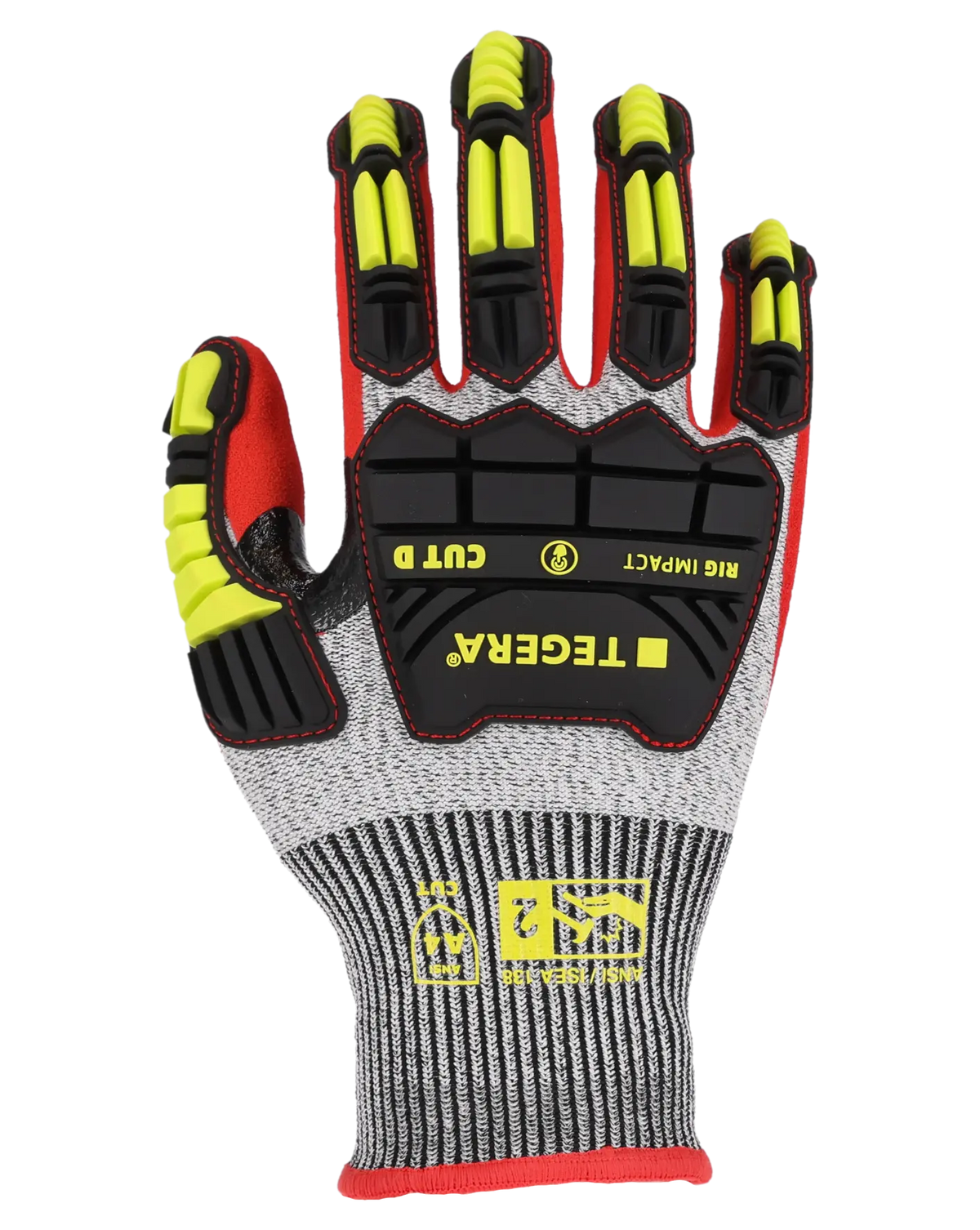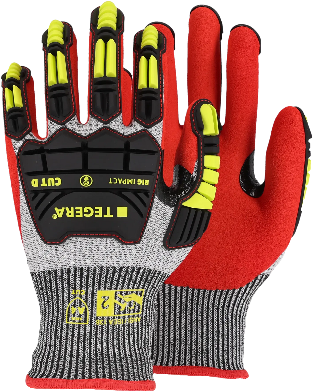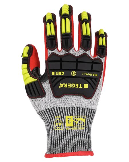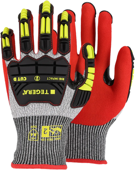 Der TEGERA® Rig Impact 422 ist ein Schutzhandschuh für anspruchsvolle Umgebungen wie die Öl- und Gasindustrie sowie den Bergbau. Er besteht aus TPR-Material für Schutz nach EN388 (P) und ANSI-Aufprallschutz der Stufe 2 und bietet eine erweiterte Oberhandabdeckung für mehr Sicherheit. Der Handschuh bietet Schnittschutz der Stufe D und Beständigkeit gegen Kontaktwärme bis zu 100 °C. Eine Nitrilbeschichtung mit angerauter Oberfläche sorgt für gute Griffigkeit, während Signalfarben die Sichtbarkeit von Handzeichen verbessern. Touchscreen-kompatibel für mehr Komfort.