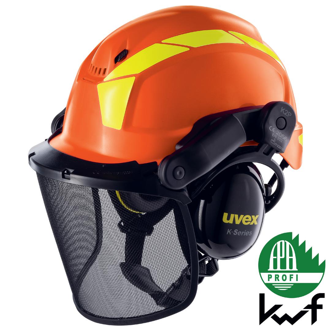 - speziell auf die Anforderungen der Wald- und Forstarbeit abgestimmtes Set bestehend aus dem uvex pheos ABS B-S-WR Schutzhelm, uvex pheos Waldarbeitervisier, uvex pheos K2P mechanisch und einer Pfeife